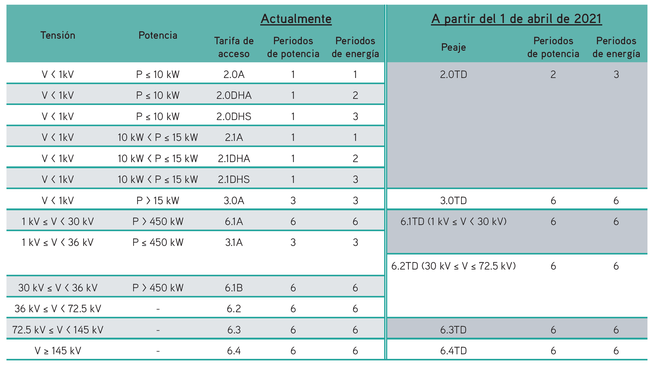 Actualmente existen 12 tarifas, que podrás seleccionar en base a la potencia contratada y los periodos que quieras. Pero a partir de abril de 2021 esto va a cambiar.
